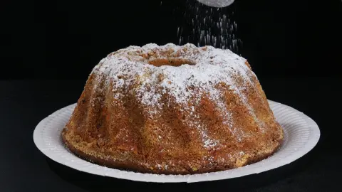- Den Kuchen erkalten lassen, aus der Form lösen und mit Puderzucker bestäuben.
