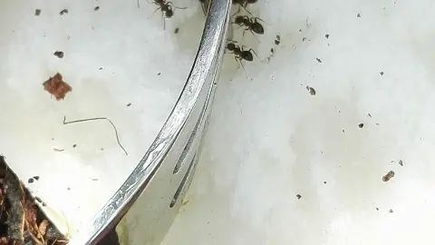Meine Aufnahme entstand 3 Minuten nach der Platzierung. Wenn die Ameisen sich erstmal auf dem Giftköder befinden (den man zuvor mittels eines Dosenöffners aus der Dose geholt und auf dem abgetrennten Deckel platziert hat), fangen genügend von ihnen an, vom Köder zu fressen und den Inhalt in den Bau zu transportieren. Somit vergiften sie ihre Königin und ihren Nachwuchs, und das Problem ist beseitigt. Im Handumdrehen wurde ich das Problem damit los.