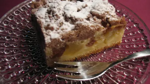 - Zuletzt werden noch alle Zutaten für die Streusel gut vermengt, daraus Streusel geformt und diese über den Apfelbelag verteilt.