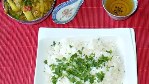 - Reis abgießen, abtropfen lassen und mit ein paar Butterflöckchen und restlichen gehackten Koriander vermengen.