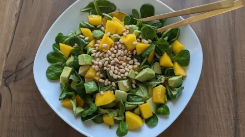 Nun abwechselnd eine Avocadoscheibe und eine Mangoscheibe leicht überlappend rund auf dem Teller anrichten. In die Mitte kann man ein kleines Feldsalat-Bouquet mit Pinienkernen setzen.