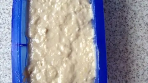 Man püriert die Bananen mit der Kokosmilch und dem Zitronensaft und rührt dann kurz die trockenen Zutaten unter. Der Teig darf ruhig noch ein bisschen klumpig sein.