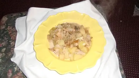 - Der rohe Blumenkohl wird geschnippelt - etwa so wie man einen Apfel für den Strudel aufschnippelt - und zu den Zwiebeln gegeben gewürzt, mit wenig Wasser aufgegossen.