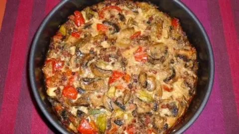 - Pilz-Zwiebelmasse wird nun gemischt mit den Eiern, den Speckwürfeln, den Paprikastückchen und dem Becher Creme fraiche.