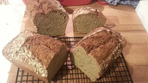 - Nachdem der Teig fertig geknetet ist, ihn in eine gut gefettete Kastenform geben und ca. 5 Minuten ruhen lassen. Anschließend in den vorgeheizten Backofen geben.