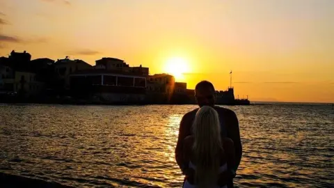 Ein Paar steht nahe dem Wasser und blickt romantisch auf den Sonnenuntergang, während die Umgebung ruhig und malerisch ist.