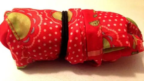 Jetzt wickle ich einfach einen Zopfgummi um die zusammengefaltete Tasche und gut ist's. So ist sie auch "ordentlich" verstaut. Wenn ich beim Einkaufen die Tasche entfaltet habe, werfe ich den Gummi einfach in die Tasche und weiß so immer, wo er ist, wenn der Einkauf erledigt ist.