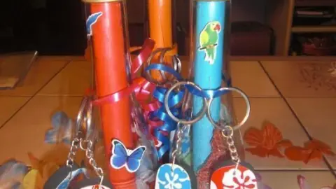 Ich habe vor eine Hawaii-Party zu veranstalten, und hab mir folgendes überlegt für originelle "Einladungskarten". Pro Einladung benötigt man: eine kleine Piccoloflasche, am besten durchsichtiges Glas, etwas Sand, Kunstblüten (habe eine Hawaiikette dafür geopfert), Geschenkband, und natürlich die Einladung (A4 Blatt mit Text - ich habe den Text auf buntem Druckerpapier gedruckt, es geht aber auch dünnes Bastelpapier), und wer mag Aufkleber (Vogel, Schmetterling, Blume, etc.), So wird's gemacht: - Zuerst einmal müssen die Piccolos von den "Aufklebern" befreit werden (ich habe sie dazu in lauwarmes Wasser mir Fit 10 Minuten einweichen lassen, danach konnte ich es mit einmal abziehen, den Leimrest einfach mit einer Bürste abbürsten) - nachdem die Flaschen innen trocken sind, mit Sand befüllen (so dass der Boden ein wenig bedeckt ist) danach habe ich 4-5 von den Blumen der Hawaiikette hineingetan. - Die Einladung hab ich so gerollt, dass sie in die Flaschenöffnung passt - nun noch den Flaschenhals mit Geschenkband "bebinden" (ich hab als Extra an den Hals mit dem Band kleine Flip-Flop-Schuhe (Schlüsselanhänger) gebunden.) Natürlich kann man genau so gut Muscheln und was noch zum Thema passt dranbinden. Zum Schluss hab ich auf die Flaschen noch ein paar hübsche Aufkleber geklebt. Fertig ist die Einladung. Natürlich kann man die Idee auch für Gutscheine oder ähnliches verwenden ;-)