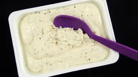 Mein Bruder liebt Natur- Frischkäse unter Marmelade auf seinem Frühstücksbrötchen (als Alternative für Butter oder Margarine)