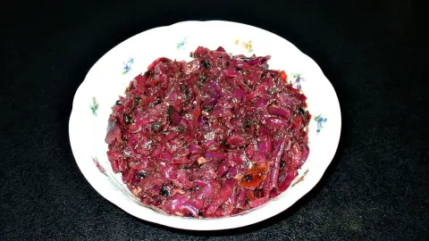 - Einen Topf mit 1/2 Liter Apfelwein aufsetzen, die Gewürze mit dem Rotkohl sowie den Apfelstücken dazugeben und ca. 30-40 Minuten dünsten.