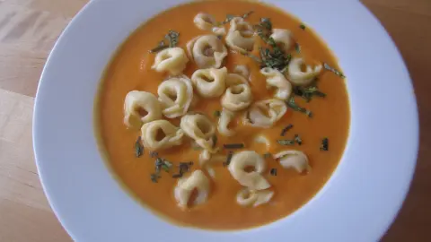 Tipp: Dazu kleine Tortellini (oder Ähnliche) geben und mit Basilikumblättern garnieren.