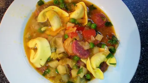 - Danach Erbsen, Tomaten und Tortellini zugeben, weitere 5 Min. kochen lassen.