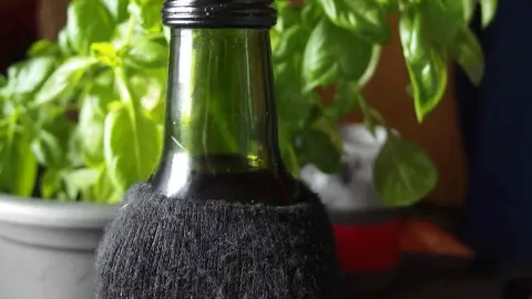 Leider hatte ich keine dunkle Flasche um mein selbst gemachtes Basilikumöl aufzubewahren. Darum habe ich eine schwarze Socke drüber gezogen. Jetzt steht das Öl auch dunkel und die Vitamine gehen nicht so schnell verloren.