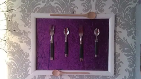 Meine Küche ist silber - lila Farben eingerichtet und deswegen nahm ich einen Samtstoff aus dunkellila mit dem auch die Sitze meiner Essgruppe bezogen sind, den habe ich auf die Rückwand eines Bilderrahmens getackert und darauf ein altes Besteck mit dem Heißkleber aufgeklebt. Danach kam der Rahmen (ohne Glas natürlich) darauf gelegt und die Kochlöffel auch mit Heißkleber am Rand beklebt.