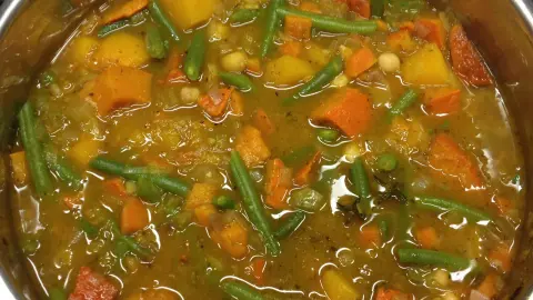 - Kürbis zurück in den Topf geben und kurz mitdünsten. Mit Essig ablöschen und mit Salz, Pfeffer, Muskatnuss, Majoran und Honig würzen und mit der heißen Gemüsebrühe auffüllen. Nicht alles auf einmal, je nach Menge so auffüllen, dass alles gut bedeckt ist. Kichererbsen und 3 Stiele Bohnenkraut zugeben und ca. 20-30 Minuten garen. Inzwischen die Bohnen in kochendem Salzwasser 5 Minuten garen. Abgießen und abtropfen lassen.