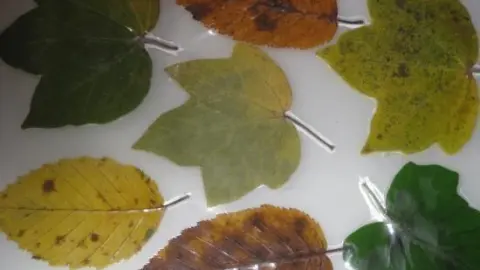 Die durchsichtige Laminierfolie mit den Blättern könnt ihr ans Fenster hängen oder in Streifen schneiden und als Mobile im Raum aufhängen.