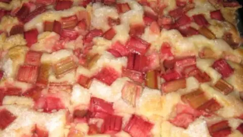 7 Stangen Rhabarber putzen, abziehen, in ca. 2cm lange Stücke schneiden, auf dem Teig verteilen.