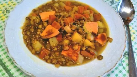 - Dann die Linsensuppe mit etwas Pfeffer, etwas Salz würzen und das verbliebene Restgemüse im Topf mit Brühe zugießen und umrühren, nun die Linsensuppe anrichten.