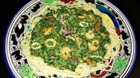 Nach der Arbeit noch aufwendig kochen mag niemand. Mit diesem Gericht zaubert man in wenigen Minuten ein warmes wohlschmeckendes und leichtes Gericht auf den Tisch: Meeresfrüchte mit Spinat auf Spaghetti.