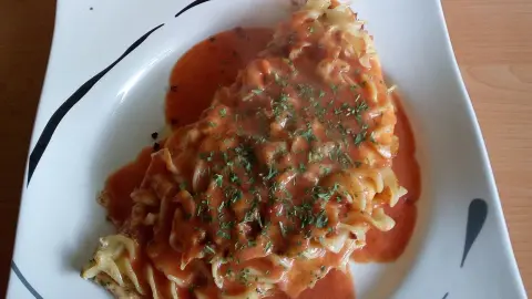 - Soße aus passierten Dosentomaten, gut gewürzt und übrig vom Paprikaschoten-Essen
