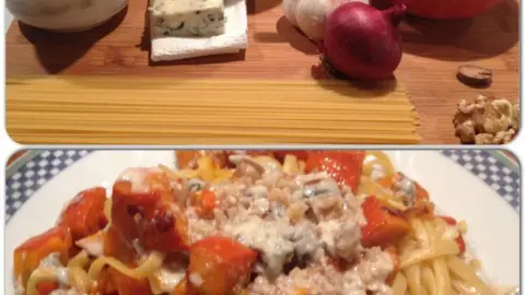 - Nudeln abgießen, abtropfen lassen, mit dem Kürbisgemüse mischen, auf Tellern verteilen und die Gorgonzolasauce darüber geben.