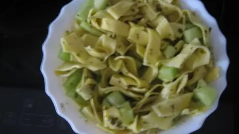 Die Nudeln habe ich mit kleingewürfelter Honigmelone gemischt, dann etwas geschnippelten Käse dazu und alles schön mit Pfeffer, Salz, Öl, Zitrone, Zucker und einige Küchenkräuter nach Wahl und Belieben abgeschmeckt.