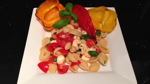 Zubereitungszeit mit den geschmorten Paprika ist 40 Minuten, der Tomaten-Mozzarella-Nudelsalat alleine, ca. 20 Minuten.