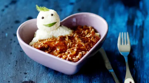 Die Reismännchen sehen witzig aus, besonders gefallen sie natürlich den Kleinen. Wer sonst außer den Reismännern, darf denn in Chili con Carne baden? Fürs Auge ist so eine dekorative Anrichtung von Reis natürlich schön.