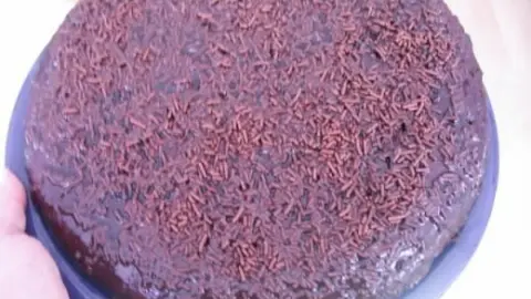5) Nach dem Backen den Kuchen 5 Min. stehen lassen und die abgeschöpfte Portion Schokosoße drübergießen. Kuchen abkühlen lassen und mit Schokostreuseln bestreuen.