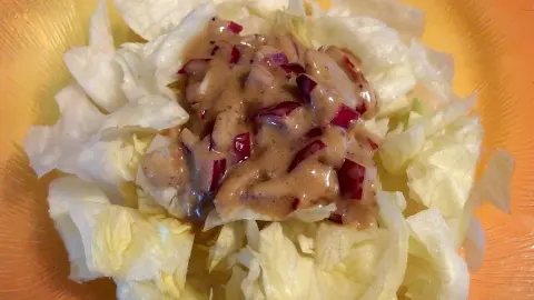 Ich mache die Sauce z. B. zu einem Eisberg/Gurkensalat.