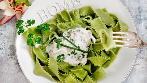 Die Nudeln koche ich immer gleichzeitig dazu. Ich nehme entweder grüne Bandnudeln oder Tortellini (jeweils 500g). Den Schinken kann man auch ganz einfach weglassen, schmeckt genauso gut!