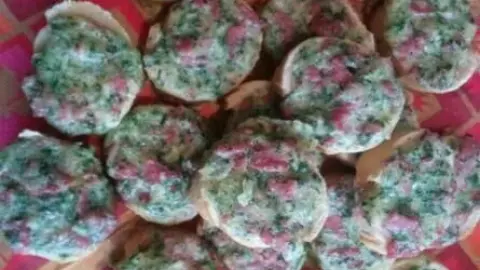 Dann die Masse mit einem kleinen Löffel auf die Brotscheiben großzügig verteilen.