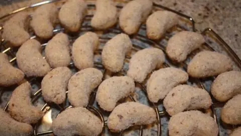 Diese Zutaten gut vermischen und druchkneten und kleine Kipferln backen (bei 180°C ca. 10-12 Minuten - oder warten bis sie leicht braun werden) danach (noch im heißen Zustand) mit Staub- und einem Päckchen Vanillinzucker bestreuen.