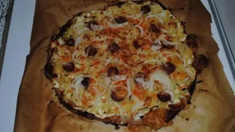 Den aufgegangenen Teig noch mal kurz durchkneten und flach ausrollen. Saure Sahne draufkleistern, dann belegen mit dem Sauerkraut, der feingeschnittenen Zwiebel und der Wurst.