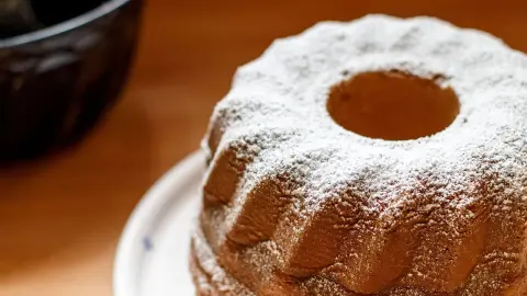 Wenn die Masse fertig, die Gugelhupfform ausgebuttert und bemehlt und das Rohr auf 180 Grad aufgeheizt ist, mischt man so rasch als möglich 5 g Natron und 10 g Weinstein (oder ein Beuterl Backpulver) unter die fertige Masse. In die Form und sofort ab ins Rohr. Der Kuchen braucht etwa 30 - 40 Minuten. Am besten mit einem Stäbchen prüfen. In der Form auskühlen lassen. Stürzen. Anzuckern.