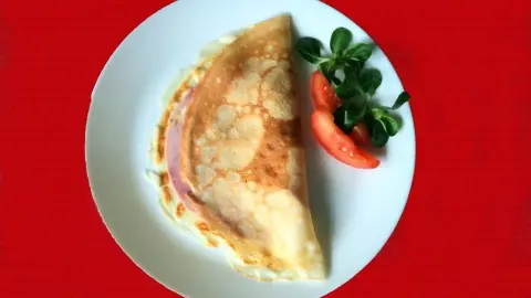Etwas Öl (ich nehme meistens Sonnenblumenöl) oder Butter in eine beschichtete Pfanne geben, auf 3/4 Hitze aufheizen. Ein oder mehrere Teelöffel Schinkenwürfel (halt nach Geschmack), am besten die mit ein wenig Speck dran und nicht zu groß geschnitten) in die Pfanne geben und einige Zeit anbraten auslassen. Dann den nochmals durchgerührten Teig daraufgeben (ich mache die Pfannkuchen immer relativ dünn) und von einer Seite ausbacken. Nach einigen Minuten (so wie ihr es sonst halt macht ) wenden. Sofort! auf die nun obere Seite Streukäse Edamer/Gouda oder ähnliches draufstreuen und die andere Seite weiter ausbacken. Wenn fertig, den Pfannkuchen hälftig zusammenklappen, das man eine Calzone mit geschmolzenem Käse innen drin hat, noch kurz ruhen lassen und der hungrigen Meute vorsetzen. Dann schnell den nächsten machen, denn die eine Portion ist schnell weg...