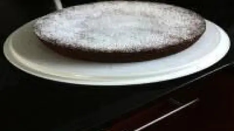 Ein runder, weißer Schokoladenkuchen liegt auf einem weißen Teller und ruht in einer modernen Küchenszene.