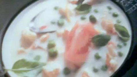Die Kokosnussmilch mit 3/4 L Wasser in einem Topf zum kochen bringen. Hitze reduzieren und die Milch ca. 2 Minuten köcheln lassen. Die Chillistreifen, die Garnelen, Tomaten und die Erbsen dazugeben. Alles etwa 2 Minuten kochen lassen.