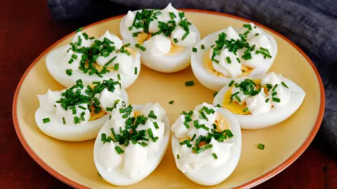 Sechs halbe Ostereier liegen auf einem Teller, dekoriert mit einer Schnittlauchcreme und frischem Schnittlauch.