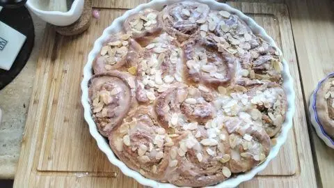 - Nun zu einer Rolle aufrollen und mit einem scharfen Messer 3–4 cm dicke Scheiben schneiden.