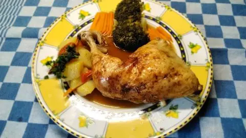 - Die Schlegel sollten fertig sein. Auf einer feuerfesten Platte ablegen, das Gemüse dazu warm halten.