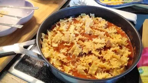 Wie praktisch, wenn man alles aus einem Topf beziehungsweise einer Pfanne kochen kann! Es funktioniert wirklich, ohne die Nudeln vorzukochen. Ich habe die gewellten Bandnudeln verwendet. Es gibt kurze und lange. Ich hatte die kurzen. Bei den Spiralnudeln ist das, glaube ich, nicht optimal. Sie sind meiner Meinung nach zu kompakt. Aber bei diesen Nudeln klappt es hervorragend. Wenn man die Reihenfolge einhält, gelingt es sicherlich.