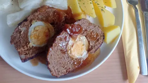 - Die Seiten klappt man über den Eiern zusammen und drückt das Fleisch rundum fest zusammen, damit die Eier gut umschlossen sind.
