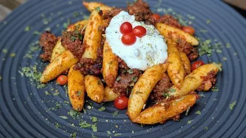 - Wenn alles fertig ist, flache Teller nehmen und Schwaben-Manti mittig darauf geben. Mit der getrockneten Petersilie bestreuen und zusätzlich noch einen Klecks vom Dip-Topping obendrauf. Das restliche Dip-Topping dazu servieren.