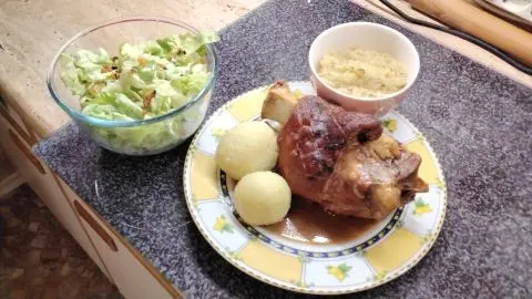 - Die Haxe sollte jetzt knusprig sein und kommt auf den Teller.