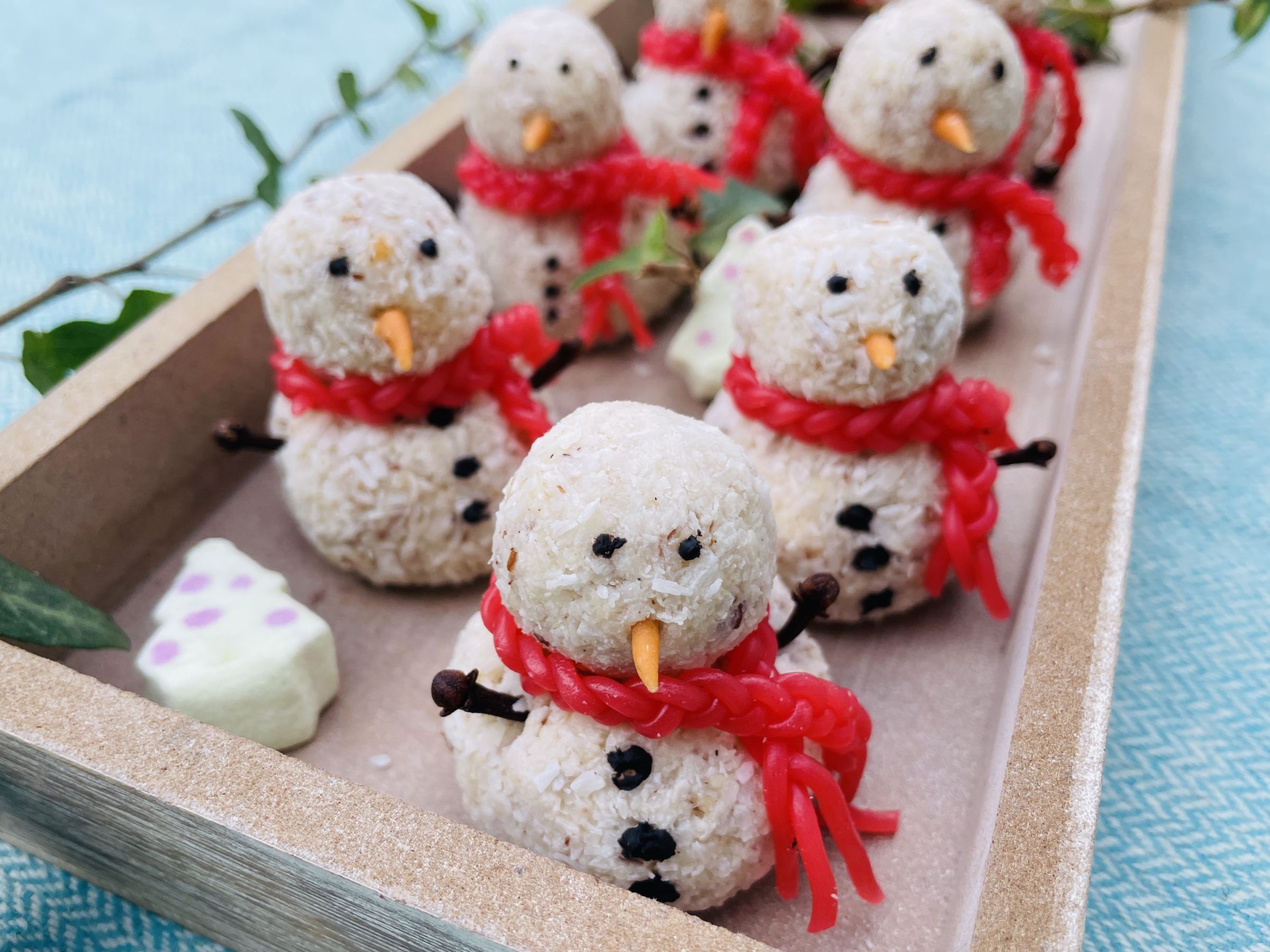 Was gibt es Schöneres, als in der Advents- und Weihnachtszeit draußen einen Schneemann zu bauen? Leider lässt der Schnee noch auf sich warten. Dann bauen wir eben mit nur wenigen Zutaten zu Hause essbare Schneemänner im Kleinformat. Kinder freuen sich riesig, beim Bauen und Dekorieren mitzumachen. Dabei sind der Kreativität keine Grenzen gesetzt. Als Ärmchen wurden Nelken in die Pralinen gesteckt. Das wirkt wie kleine Äste, die auch in dem großen Vorbild aus Schnee stecken. Der Schal besteht aus geflochtenen Weingummischnüren.