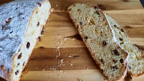 - Wenn der Christstollen ausgekühlt ist, kann er mit Puderzucker bestäubt werden.