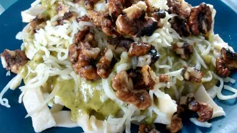- Die gekochten Nudeln auf den Teller geben, Pesto Soße dazu und geriebenen Emmentaler darüber streuen.