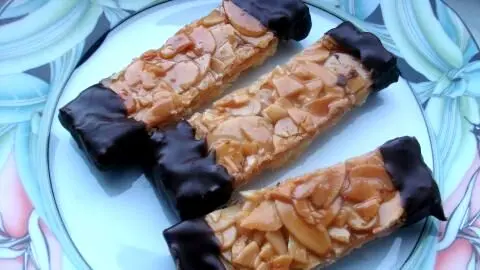 - Jetzt kann man die Florentiner Schnitten jeweils an beiden Enden gut in die Schoki eintauchen.