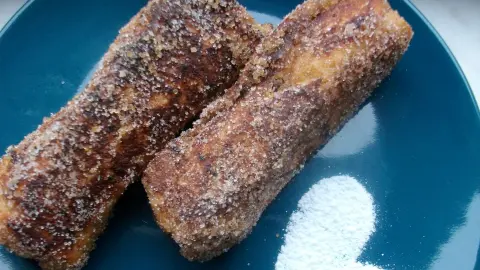- Die Toastrollen sofort in der Pfanne, mit zerlassener Butter, von allen Seiten goldbraun anbraten. Okay, meine waren einen Tick dunkler, war geschmacklich aber kein Problem.